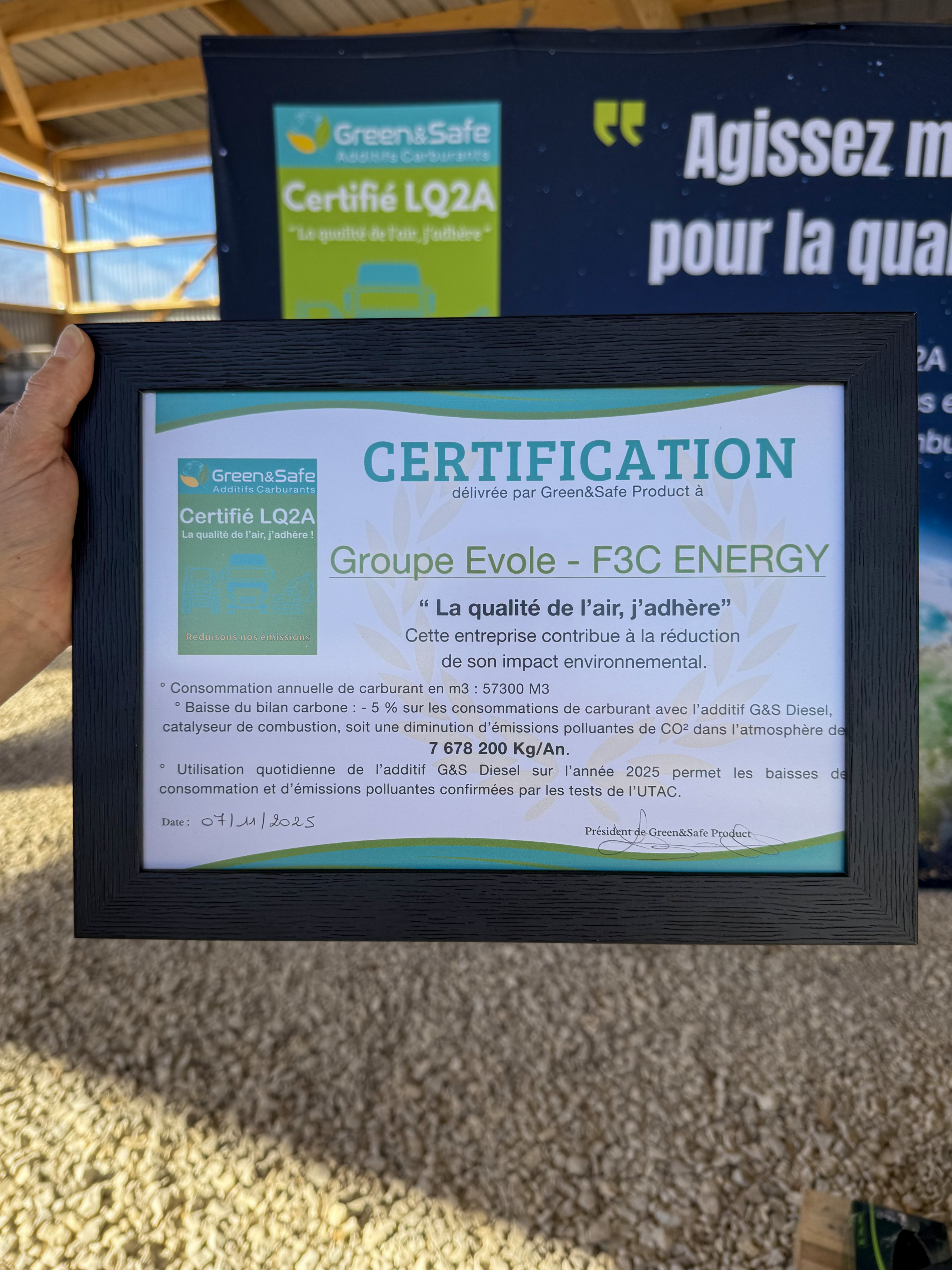 Chez Évole Énergies, notre engagement pour une énergie responsable se renforce jour après jour. Nous sommes fiers d’annoncer que Green&Safe Additifs nous a décerné la certification LQ2A – “La Qualité de l’Air, j’Adhère”, une distinction qui récompense les entreprises agissant concrètement pour la qualité de l’air et la performance énergétique.